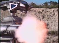 Trooper Terminator fires his laser arm up at the approaching missile, blowing it out of the sky. |