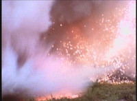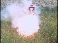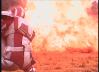 VR JB turns around twice, as he finds himself surrounded by four Skugs, who suddenly proceed to take off their heads and kick them at him! They explode on impact, the massive fireball burst projecting VR JB into the air briefly. He lands on his back, then recovers, clutching his smoking body wearily. |