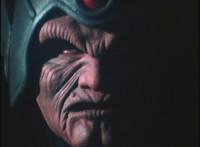 Close on Grimlord, talking as his eyes glow red, then his right fist clenches and glows red as well. |