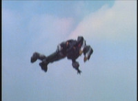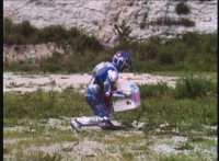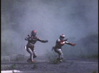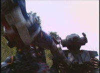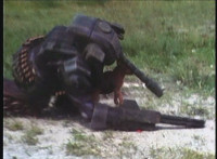 VR Ryan leaps up and floats across the field as dirt bursts erupt below. He lands, rolls, and grabs Ballistix, where they struggle with one another for a few moments, internal parts of VR Ryan working overtime. Finally, VR Ryan gets the upperhand and tosses Ballistix skyward. He flies straight up, then begins to come down, so VR Ryan leaps up and punches him in the solar plexus, then grabs him and throws him forth. Ballistix is flung into Trooper Terminator's headless carcass, exploding massively. VR Ryan watches proudly. |
