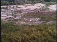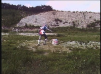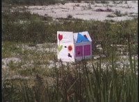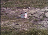 Pan across a field, stopping when we see where a small white box is. VR Ryan reacts, as shot zooms in on the box. |