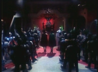 Slight lowering of the camera as a pair of women finish walking down the center of the Virtual Dungeon and bow before Grimlord. |
