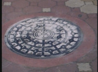 The camera approaches a frosted manhole cover. |
