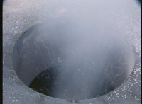 The suddenly open manhole spews frost upward. |