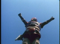 Cuts before he points forth; cuts follow-up of Troopertron firing lasers downward. |