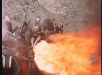 VR JB rises up from the burning crater, slightly smoking but unharmed. |