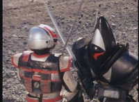 General Ivar leaps off a hill at VR JB, who lies on the ground and rolls out of the way, then locks blades with Ivar. |