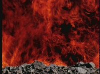 A pair of female figures, glowing, leap through the flames. |