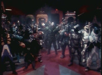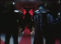 The camera pushes forth through the crowded Virtual Dungeon, past numerous wandering mutants, to show the empty throne between Zelton & Decimator. |