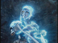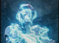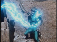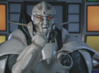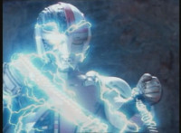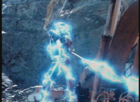 VR Ryan holds on tightly as both he and Dreammaster get electrified some more. Finally, Dreammaster's airtank on his back glows, then explodes, killing the power. Dreammaster is dazed, so VR Ryan releases the chains, the mutant staggers back, then VR Ryan flips over and jumpkicks into Dreammaster, knocking him down. VR Ryan lands, then charges up his Lightning Hand, before leaping up and chopping downward, as his inner circuitry lights up, and he and Dreammaster sparkily strike each other at the same time. |