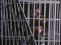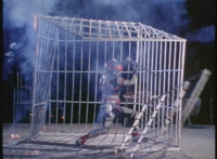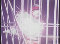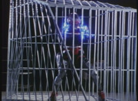 VR JB bursts, rolls, and recovers, when suddenly metal rods begin to slide in around him, forming a cage around him. VR JB then grips the bars, getting a charge from them. |