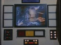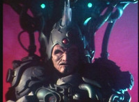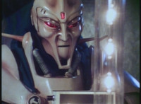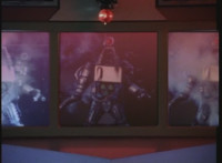 Grimlord's energy summons an energy screen above the mutants in the Dungeon, forming an image of Colonel Icebot as he talks close with a fist raised that he slowly lowers. |