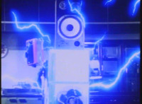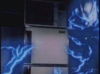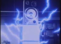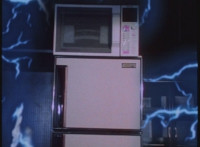 Amid electricity crackling, a stereo speaker, a vacuum, a fan, a lamp, and a toaster connect with the fridge to form Ultra MegaFrigidareZord! |