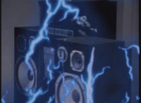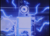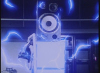 The lab viewscreen shows, amid electricity crackling, a stereo speaker, a vacuum, a fan, a lamp, and a toaster connecting with the fridge to form Ultra MegaFrigidareZord! |