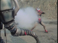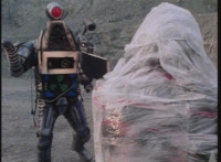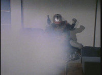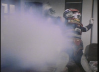 VR JB stands back up to face Vacbot, who suddenly fires eyebeams at him, bursting him into falling over. Vacbot opens his chest compartment and spews frozen mist forth, overwhelming VR JB until he finds himself frozen in seran wrap. Vacbot approaches the frozen VR Trooper, who is unable to move. |