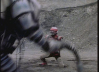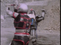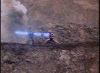 Vacbot taunts VR JB from atop a cliff, before leaping off and swatting him down. VR JB recovers, strikes him with his saber a time or two, only for the blade to get caught in Vacbot's vacuum arm. They struggle, and VR JB ends up getting flipped over, losing his saber. |