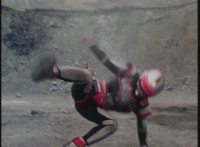 VR Kaitlin falls and rolls in a quarry, then gets up into a crouch, then turns sharply. |