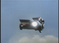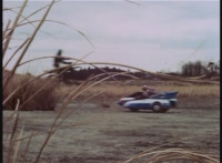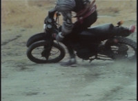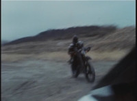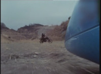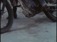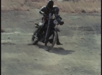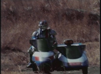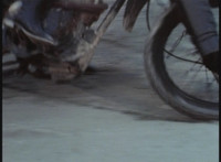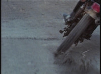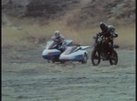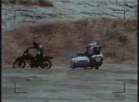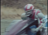 Cuts follow-ups of sidecar hitting his bike, knocking it over. |