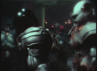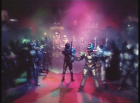 The mass of mutants are in a quarry, firing lasers on some cutouts, zoom in on Slashbot sparring with both Magician and Fistbot. |