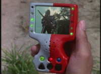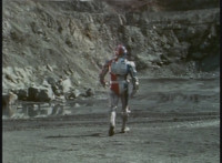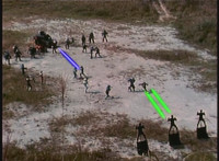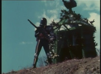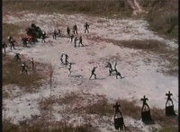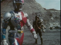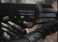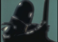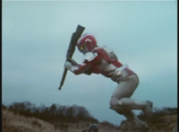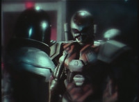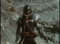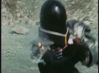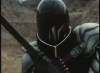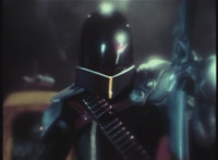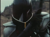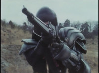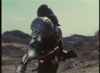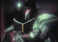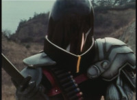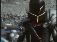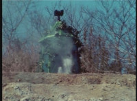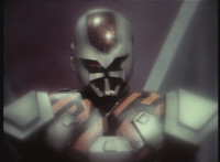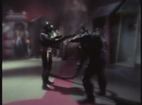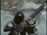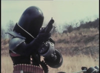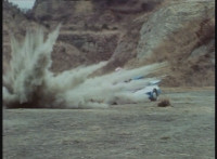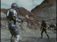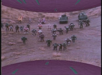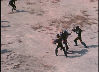 Parked, Dark Heart aims his rifle at VR Ryan and fires away at the also parked VR Trooper, who sits on his Turbo Cycle as dirt bursts erupt around him, engulfing him. When the smoke clears, he's missing from the cycle, to Dark Heart's surprise! He glances to the side. |