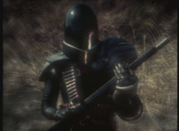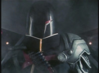 Dark Heart flips over in midair, landing on the ground but losing his rifle. VR Ryan whips out a knife, Dark Heart looks up, VR Ryan flips over, Dark Heart dives and grabs his rifle and prepares to fire up, but VR Ryan tosses his knife, stabbing him in the shoulder. Dark Heart tosses his rifle into the air, VR Ryan snags it out of the air, and lands, aiming the weapon at its owner. VR Ryan talks, Dark Heart responds, more talking between the two. |