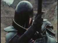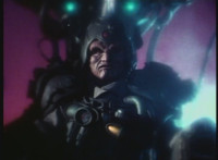 Medium shot of Grimlord talking a lot, then zoom in on Grimlord raising his right hand. |