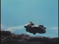 VR Ryan drives the Turbo Cycle out of the hangar, then is in flight flying away from us, before landing it in rough terrain. |