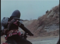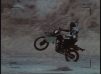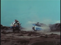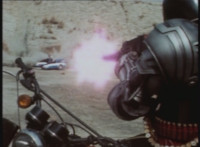 The Turbo Cycle rides right toward Dark Heart on his own motorcycle, Dark Heart skidding to a stop, pulling out his rifle, aiming at VR Ryan, firing, and dirt bursting in front of the Cycle. |