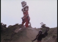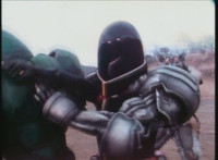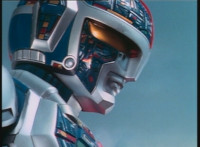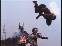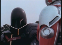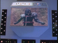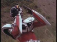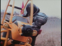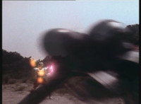 In Monoeye POV, Dark Heart drives his motorcycle along a quarry road. Fighterbot begins to turn his flying body vertically, while keeping a target lock on Dark Heart. |