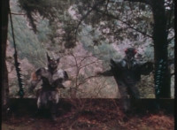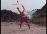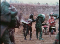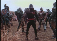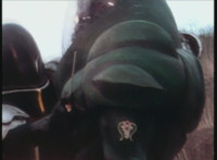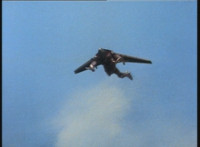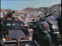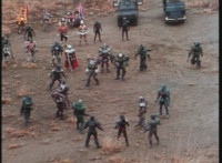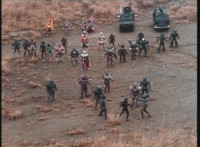 Cuts prior shot of Air Striker leaping up; shot 2 is recycled, per source; cuts follow-ups of mutants hopping onto vehicles and taking off. |