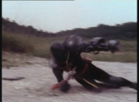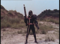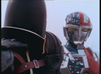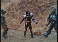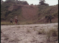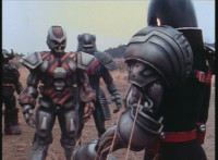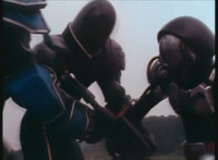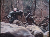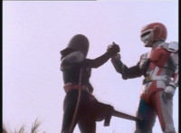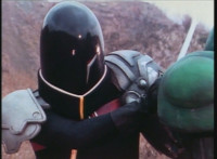 Renegade talks to Dark Heart as we zoom in on the latter as he replies and raises his rifle. Zoom out from Renegade as he speaks and gestures. |