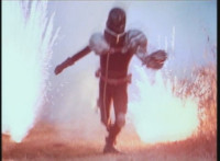 More dirt bursts and explosions erupt around Dark Heart on the cycle, until he leaps off the bike and flips over onto the ground. |