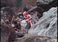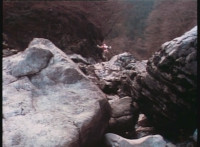 VR Ryan appears atop a boulder, a few angled beauty shots, then he leaps off it, and lands across the way on another rock, looks around, then hops off. Tankotron and Cannonnose are nearby, the former talking to the latter, who reacts. VR Ryan races along a rope bridge. |