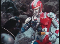 Zoom in on Dark Heart, head damaged and wires hanging out of his body, as he collapses between some boulders. |