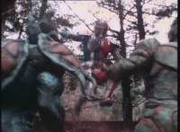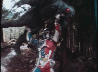 VR Ryan jerks his arm, then rushes off. Bugbot and Spitbot appear in the nearby woods, and rush down the hill but upon reaching the bottom, they suddenly turn to our right, and VR Ryan jumpkicks in, hitting both in the head. VR Ryan lands, turns, and sees Wolfbot and Flybot rushing up onto the scene. They find him missing when they reach his position, then he pops up behind them, flipping Flybot over, then flings Wolfbot aside. VR Ryan picks up Flybot like he's an empty suit, lifts him overhead, then tosses him into the ravine. VR Ryan then turns his head sharply. |