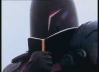 Close on Grimlord talking and looking from side to side. |