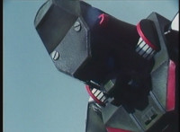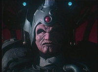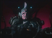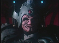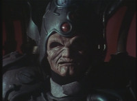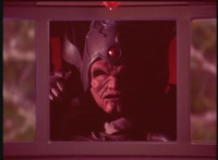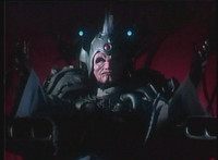 Sharp zoom in on Grimlord, talking as his eyes glow red, then his right fist clenches and glows red as well. |
