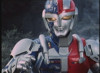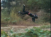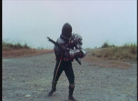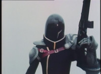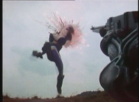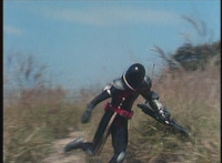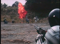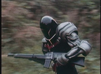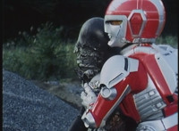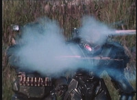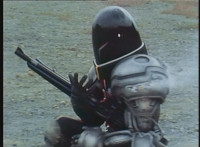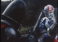 Dark Heart slaps his rifle to his hand and looks up, as Spitbot leaps in. He rifle butts him away, does the same to one of Fistbot's fists, then aims and fires on Fistbot, bursting him down, where he rolls and explodes. Spitbot extends his arm, grabbing Dark Heart's rifle as he struggles with it, getting pulled and rolling across the ground twice, before Dark Heart turns and fires upon Polarbot on a nearby hill. He rolls to the bottom and explodes, as Dark Heart keeps fighting for control of his rifle. Slashbot rushes in with his saber, sparkily slashing Dark Heart, as Spitbot releases his grip on his rifle, so he rolls to the ground ,smoking. He gets in a crouch and looks around, when Magician leaps in, he dodges, then leaps up and fires, bursting Magician down. Dark Heart blocks Slashbot's blade with his rifle, then breaks off, goes to fire, then ducks when he slashes, Wolfbot leaping past, Dark Heart spinning around in a daze. Renegade lurks in the nearby grass, his pistol ready. Dark Heart dodges and spars with the three mutants, until Wolfbot spews energy binds that wrap around him. Dark Heart keeps fighting, Renegade takes aim on him and fires, bursting until he falls and rolls down a hill. At the bottom, Renegade takes aim again and fires, bursting his helmet until it breaks open, and he falls over. |