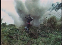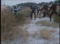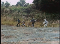 Renegade reacts, then points and rushes forth, Chromedome & Hornbot following, then more mutants races forth. Dirt bursts erupt in the quarry around Dark Heart, he soon escapes into a rocky beach, then passes along the river's edge as water bursts erupt near him. Dark Heart then hides beside a rock for a moment, then presses onward, heading into the tall grass again, pausing soon to look up, seeing Fighterbot swooping around. Dark Heart treads cautiously, then spots Tankotron and Cannonnose ahead. So he heads the other direction, but the pair spot him and fire upon him. Dirt bursts erupt around Dark Heart as he rushes through a field. |