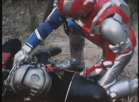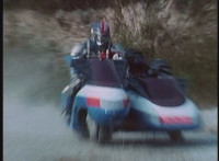 VR Ryan leads Dark Heart through the grassy hill down to the VR Turbo Cycle, places him against it, then turns to face Wolfbot, who leaps in, kicking him away. Invincible Blade tries to grab Dark Heart, but VR Ryan punches him off. VR Ryan hops his cycle, and drives off with Dark Heart in the sidecar. They drive through a field, mutants trying and failing to grab them as they pass. Tankotron & Cannonnose fire, dirt bursting around the VR Turbo Cycle, but failing to stop it. |