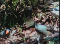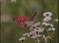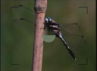 Camera POV of some birds eating, a butterfly on a flower, and a dragonfly. |