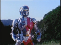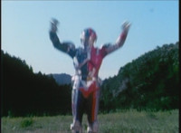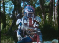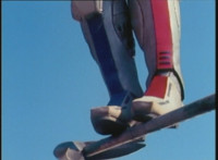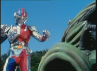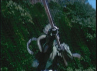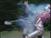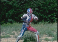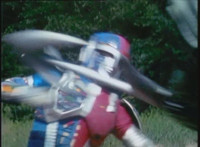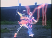 VR JB motions his arms about while his body trails, until he erupts into sparkle particles that reassemble as a giant energy image of him using the VR Techno Bazooka, firing both cannons forth. |