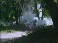 Dirt bursts erupt on the road around VR Ryan and the Furry Wombat, until they split up and dive into the woods. |