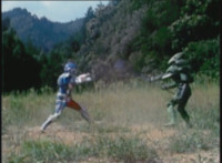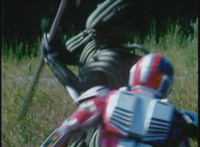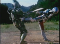 VR Ryan faces off with Horrorbot, both rushing at each other. VR Ryan dodges and kicks, until Horrorbot lands a smokey blow against him, soon flipping him over for a moment. VR Ryan recovers, only to get smokey-struck again by Horrorbot. VR Ryan finally leaps up as Horrorbot thrusts forth, landing on his extended harpoon. Horrorbot reacts, as VR Ryan stands on his weapon in midair, then kicks him away. |