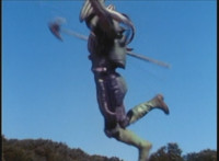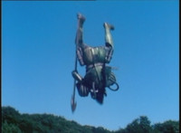 Horrorbot recovers and slashes at VR Ryan, who dodges, blocks, then kicks him. Another block leads to him flinging Horrorbot away, then leaping up and flipping over three times, before corkscrewing his body forth. |