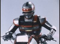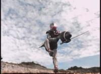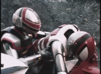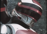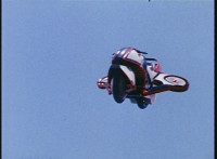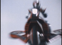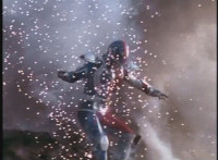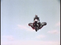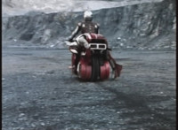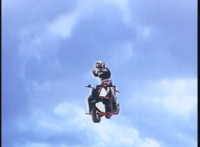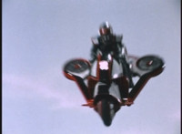 VR JB does a flip, and lands on the Fighterbike, poses, then flies forth. |