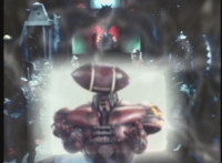 On Grimlord's energy screen above the mutants, is an image of zoom in on VR Ryan, lying unmoving on the beach. |
