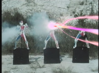 Three cardboard cutouts of VR Ryan get blasted by rainbow eyebeams. |