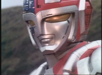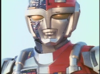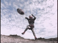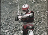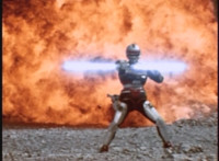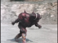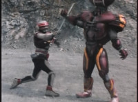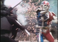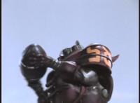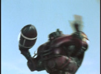 Footbot tosses his football head forth, VR JB catches it in midair, spins around and tosses it back, hitting him and causing him to dirt burst as VR JB lands and poses. The smoke clears, and Footbot remains. VR JB stands defensively, Footbot rematerializes his football head and detaches it, so VR JB gestures his saber. |