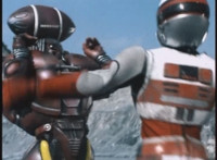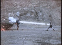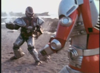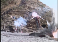 VR Ryan gets battle ready, then races away from Zelton as he fires blasts from his knuckles, bursting around the beach. VR Ryan flips over amid sparks and smoke, falling and rolling on the sand and soon dropping lifelessly. |